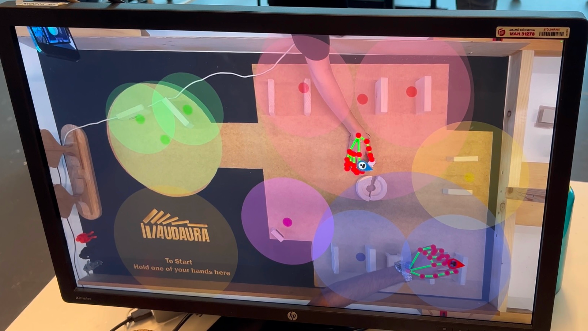 To make the aquarium truly interactive, I implemented the Google MediaPipe machine learning model. By processing a live feed of the room, the system tracks the skeletal positions and hand movements of visitors in real time. This spatial data is translated into "attraction points," allowing visitors to physically draw the digital fish toward them as they approach the screen.