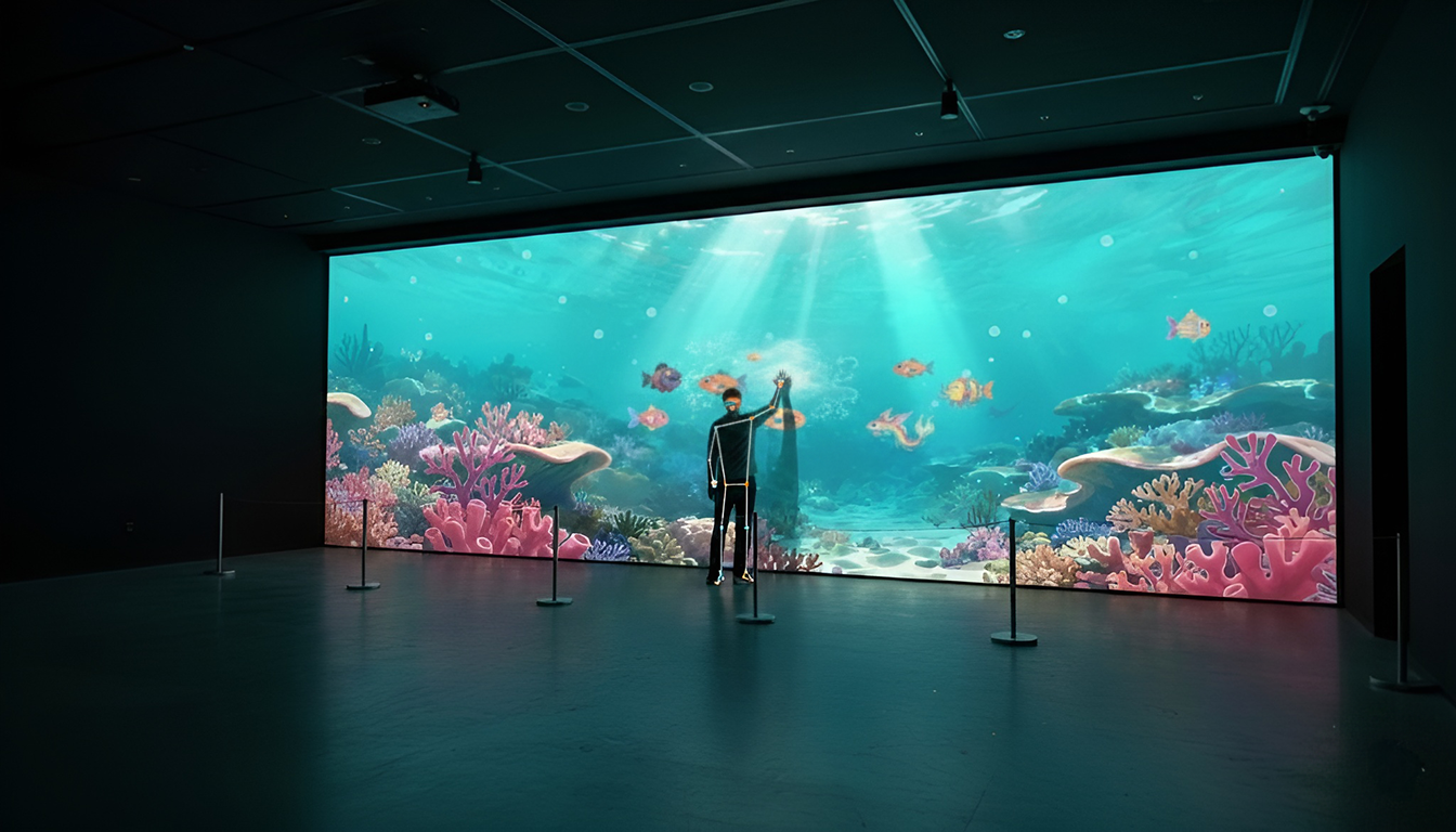 Attraction: The system tracks the body and hands of visitors. By reaching out toward the screen, you can attract the fish toward you.