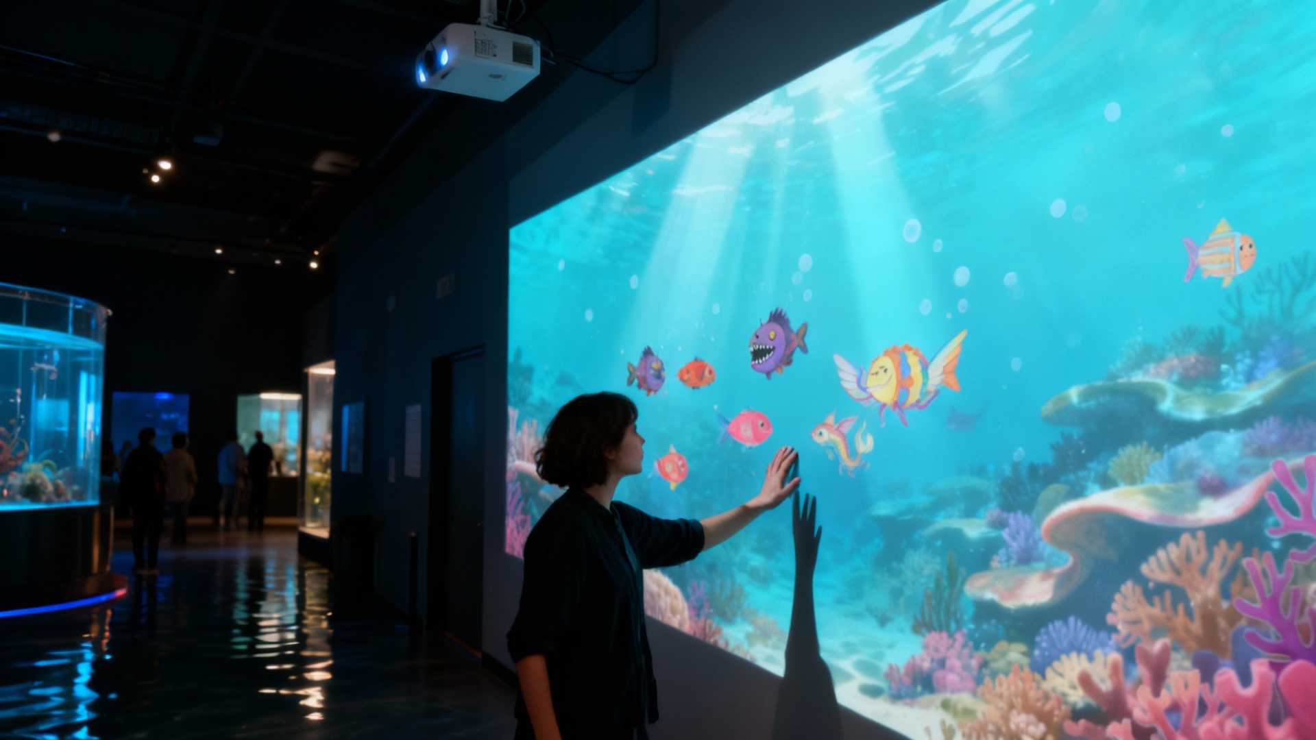 Within seconds, your custom-colored creature comes to life as a 3D-animated fish on a floor-to-ceiling projection. While fish eventually swim off-screen, they are never truly gone; they are saved in a digital archive and will occasionally return to the aquarium to "say hello" to future visitors.